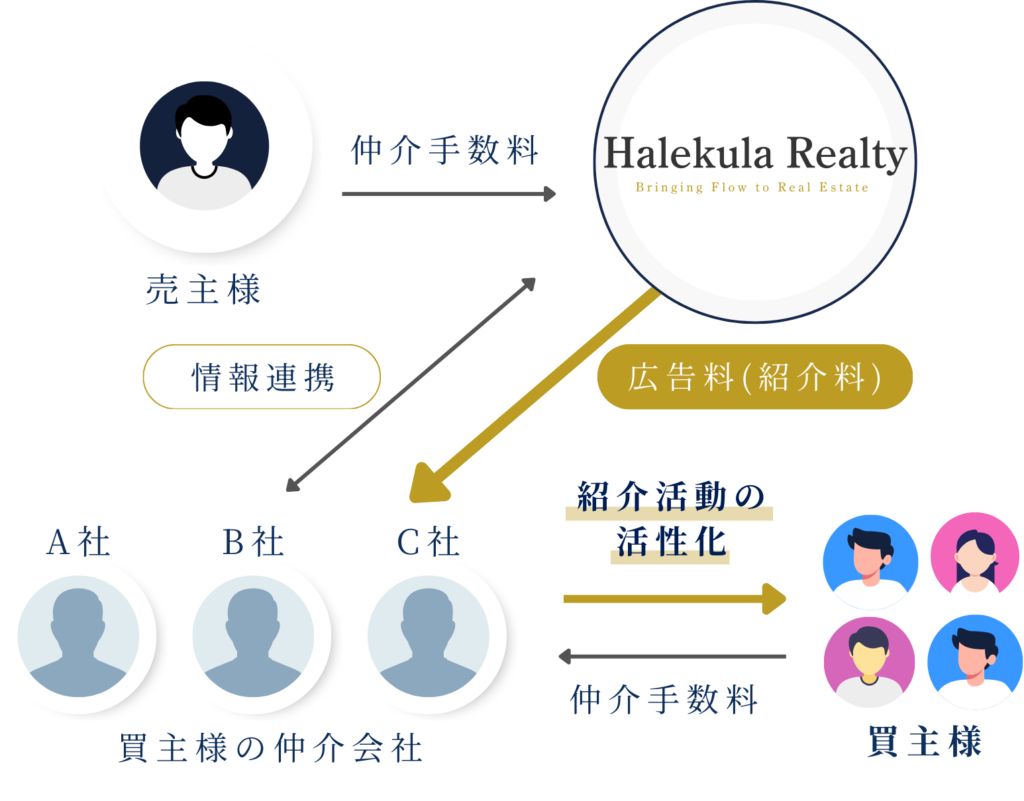 ハレクラ不動産は複数の買い手側仲介業者に対し、物件の魅せ方や条件など細かい注文を伝えたうえで、買い手候補への物件紹介を依頼します。 その対価として御礼手数料を支払い、各業者の販売意欲を高めることで、売却スピードと価格の双方を大幅に向上させます。